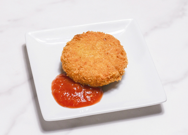 ジューシーなメンチカツに、ほどよい酸味のトマトソースをたっぷりとかけました。